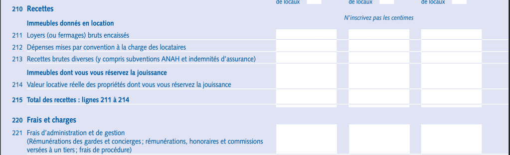 - Les recettes perçues : lignes 211 à 214 du formulaire 2044,